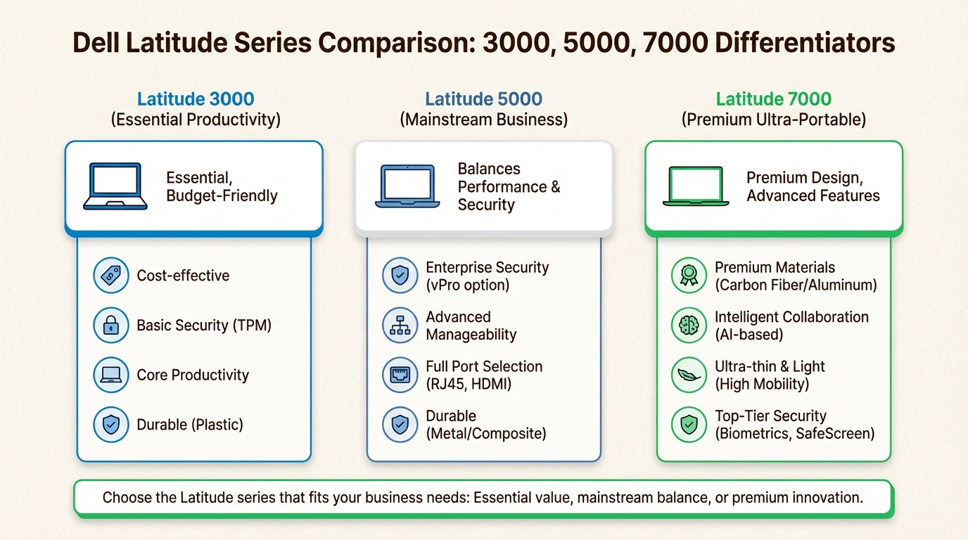 Gama Latitude este concepută special pentru mediul corporativ, cu accent pe securitate, durabilitate și ușurință în managementul IT. Dell organizează această gamă în trei serii principale: 3000 (entry-level), 5000 (mainstream) și 7000 (premium).
